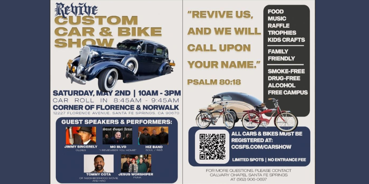 Revive Custom Car and Bike Show Outreach May 2nd 10AM-230PM. Music by MC BLVD, Jimmy Sincerely and a message by Pastor Tommy Cota. Cars should pre-register free. Kids crafts, raffle and food vendors will be present. Come out for this free event and bring a unsaved friend