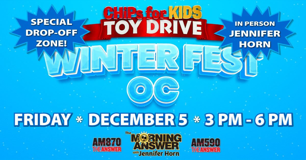 Jennifer Horn, Host of The Morning Answer invites you to bless a deserving Child or Teenager this Christmas when you Donate a New, Unwrapped Toy, Sporting Goods or Gift Card to the California Highway Patrol's CHiPs for Kids Toy Drive. Join Jennifer at Winter Fest OC at the OC Fair and Events Center, 88 Fair Drive, Costa Mesa 92626 on Friday, December 5, 2025 from 3:00 pm to 6:00 pm.